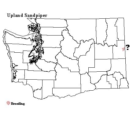 The Canadian Wildlife Service estimates the Upland Sandpiper population at about 350,000 birds. Most of the population is concentrated in the Great Plains, where they are still common. In both the northeastern and northwestern portion of their range, Upland Sandpipers have become far less common. Although they were probably never abundant in the Northwest, they formerly bred widely in eastern Washington. With the loss of native grassland habitat, the Northwest population has now dwindled to a few small, isolated populations. The last remaining Washington population, near Spokane, is most likely extirpated. With the Spokane population gone, a small population in Idaho, another group in Montana, and a few dozen pairs in Oregon are the only breeding Upland Sandpipers that remain in the Northwest. The Upland Sandpiper is still listed as a state endangered species and a Gap Analysis species-at-risk.