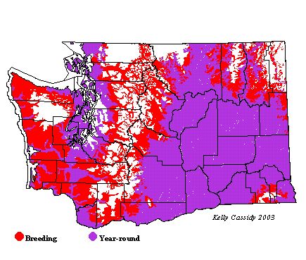 American Kestrels are common in open habitat at lower elevations in eastern Washington. They are present but much less common in similar habitat in western Washington, especially in the north. They can also be seen at high elevations in open, rocky areas and in high meadows, up to about 6,000 feet. They can be found in the southern Puget Trough, the Upper Skagit River area, eastern King and Pierce Counties south to Trout Lake, and above the tree line along the crest of the Cascades. They are absent as a breeder on the Olympic Peninsula, except in the Sequim-Port Townsend area, although it is possible that they are breeding there and have not been reported.