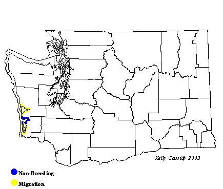 Marbled Godwits are most likely to be seen in protected estuaries along the outer coast, from Grays Harbor south, from April to early May, and from July into October. Birds seen later in the fall, from September to October, are usually juveniles. Large flocks often feed on the golf course in Ocean Shores (Grays Harbor County) in the spring. A flock also winters regularly at Tokeland in Willapa Bay (Pacific County). Other possible sites are Blaine (Whatcom County) and Sequim (Clallam County).