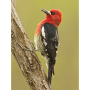 Red-breasted Sapsuckers are similar in appearance to the closely related Red-naped Sapsuckers, but they have red heads and breasts. Their upperparts are black barred with white, and they have a prominent white stripe across each black wing. They lack the black breast-band of the other two sapsucker species found in Washington, and they have yellowish bellies. Males and females look much alike. Juveniles are mottled brown but have white wing-stripes like the adults.