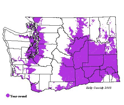 Rock Pigeons are widespread and common year round at lower elevations throughout Washington, especially in cities and farms. In eastern Washington they are also found on basalt cliffs along the Columbia River in the Columbia National Wildlife Refuge (Grant County). They are absent from heavily forested areas.